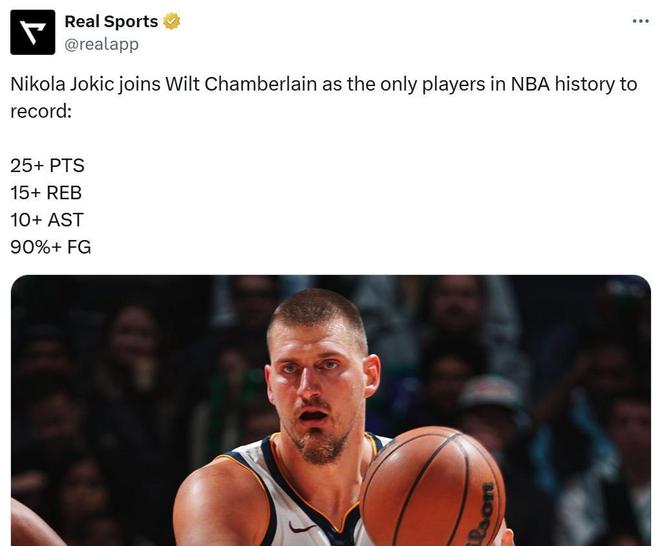 同时约基奇成为NBA历史上继张伯伦之后,第二位以至少90%命中率拿下至少25+15+10的球员。